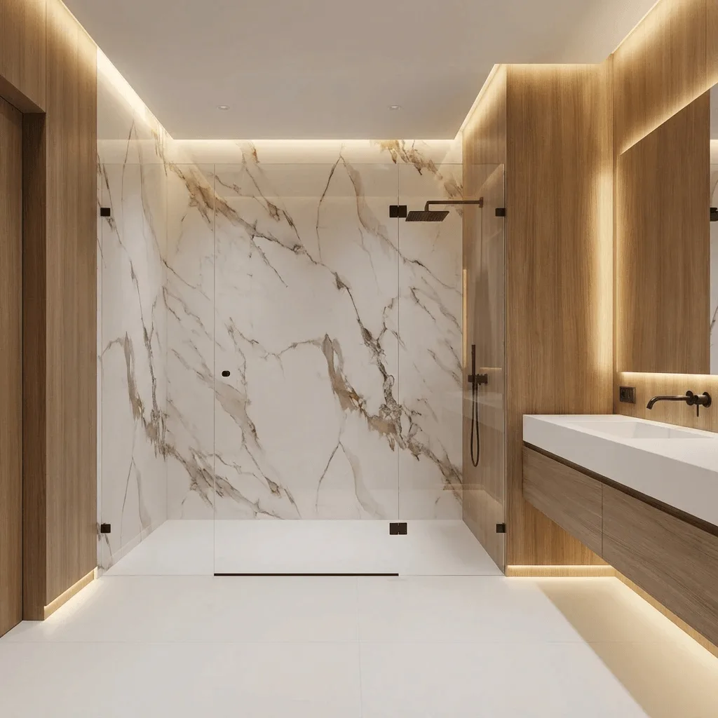 Luxurious PVC panel with golden Calacatta effect. Premium look for exclusive spaces.