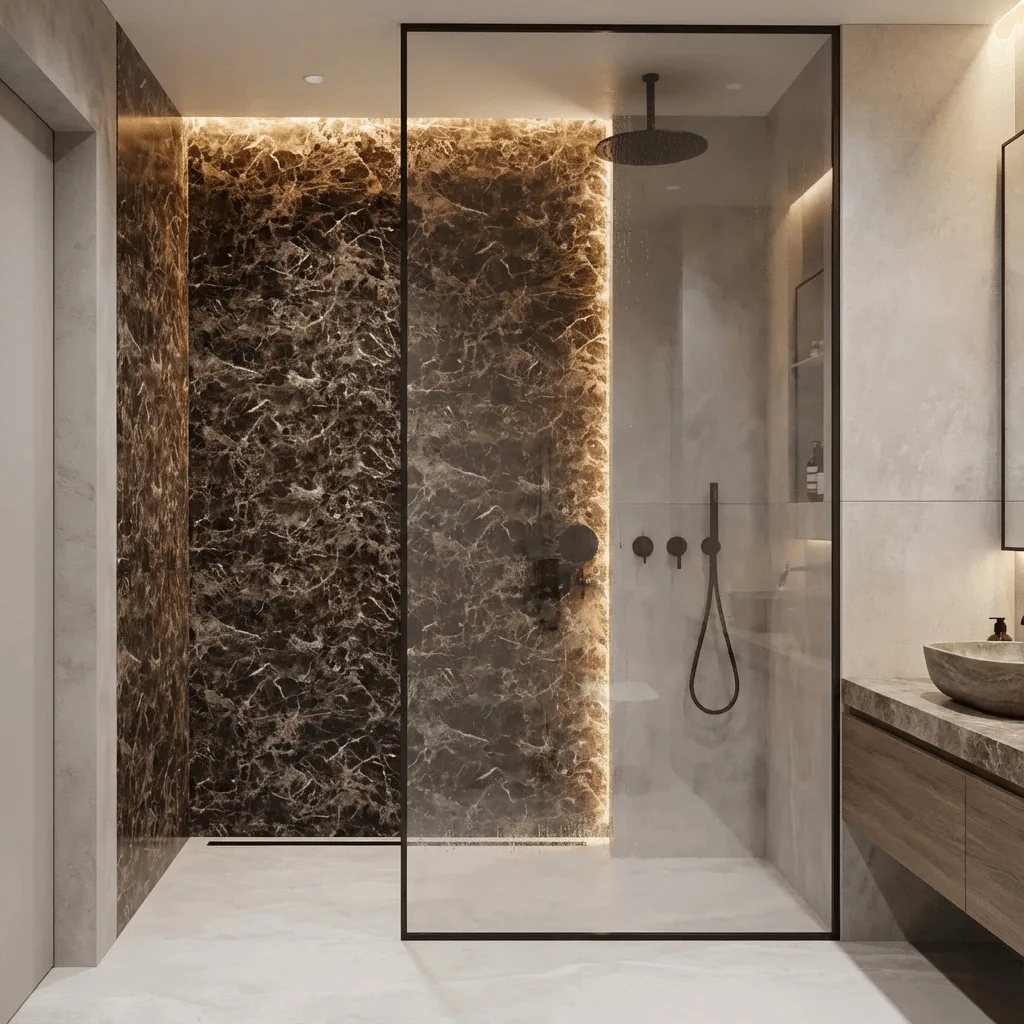 PVC panel with Emperador marble effect. Dark elegance for sophisticated spaces.